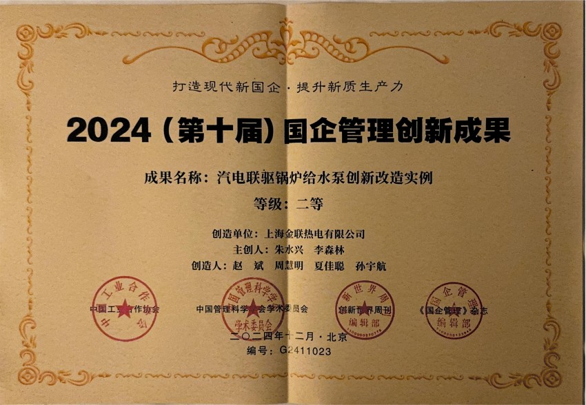 汽电联驱锅炉给水泵创新改造实例荣获 2024(第十届)国企管理创新成果二等奖